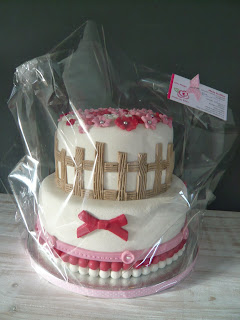 De stapeltaart was besteld in de kleuren wit, fuchsia en lichtroze. Vorig jaar had ik een 'lentetaart' gemaakt en die moest het ongeveer worden. Het zat allemaal mee en in nog geen 4 uur was de hele stapel klaar, inclusief bakken, vullen, botercrème maken, bekleden, bloemetjes maken enz. Ik denk dat het een nieuw record is...